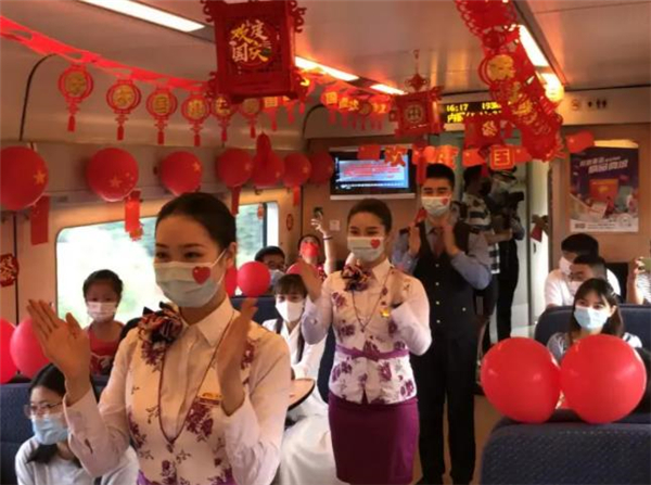 在布滿(mǎn)紅色氣球、燈籠和窗花妝點(diǎn)的車(chē)廂,旅客們揮舞著(zhù)手中的五星紅旗共同高歌歡唱祖國,歌聲、掌聲、歡笑聲久久回蕩……這里是成都客運段首發(fā)雅安到重慶北直達動(dòng)車(chē)...