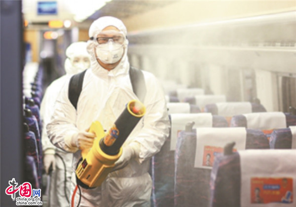 防疫消殺,程序非常嚴格。對于那些確診、疑似病例和無(wú)癥狀感染者及發(fā)熱旅客乘坐過(guò)的車(chē)廂及鄰近車(chē)廂,消殺人員必須“全副武裝”,用含氯消毒液做好消殺。